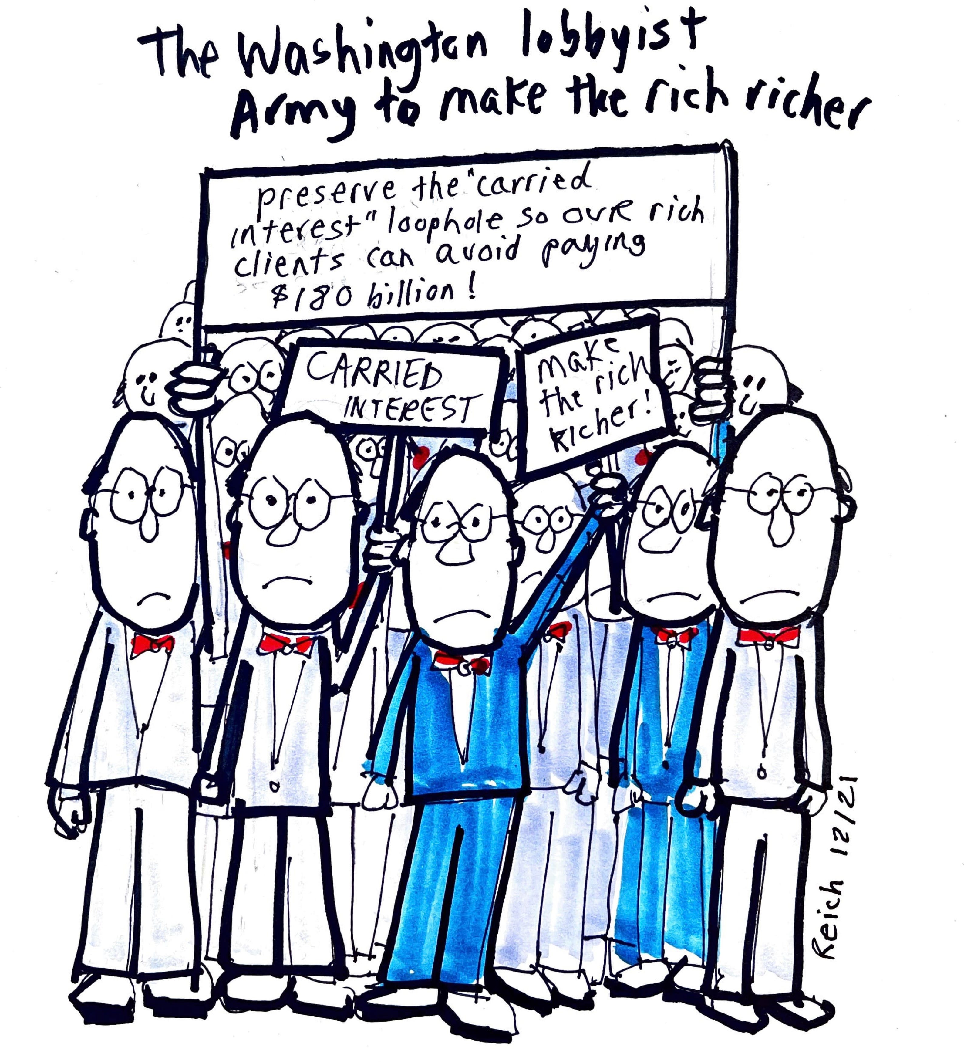 Well, if Democrats are willing to take another stab at tax reform, I’ve got just the candidate: Get rid of the “carried interest” loophole that lets private equity managers – among the wealthiest people in America – pay a tax rate lower than most Americans. The “carried interest” loophole is huge, and it’s a pure scam. Private equity managers get this tax break even though they invest other peoples’ money. They don’t risk a penny of their own.