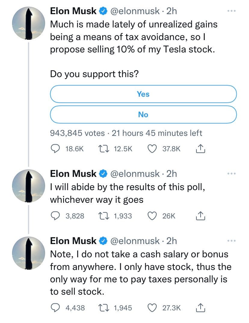 So last weekend, seeking to call a symbolic bluff on advocates of taxing wealth, he asked his millions of Twitter followers whether he should sell 10 percent of his Tesla stock. He committed to abide by the results of the poll. (He faces a contractual deadline for selling a load of stock options anyway.) By the time he closed the poll Sunday, nearly 3.5 million votes had been cast. 58 percent were in favor of him selling.