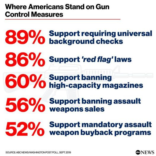 The American people are not at all evenly divided on these issues. According to nearly every poll, wide majorities (including many G.O.P. voters) support requiring universal background checks for would-be gun purchasers, and most support “red flag” laws, bans on high-capacity magazines, and bans on sales of assault weapons.