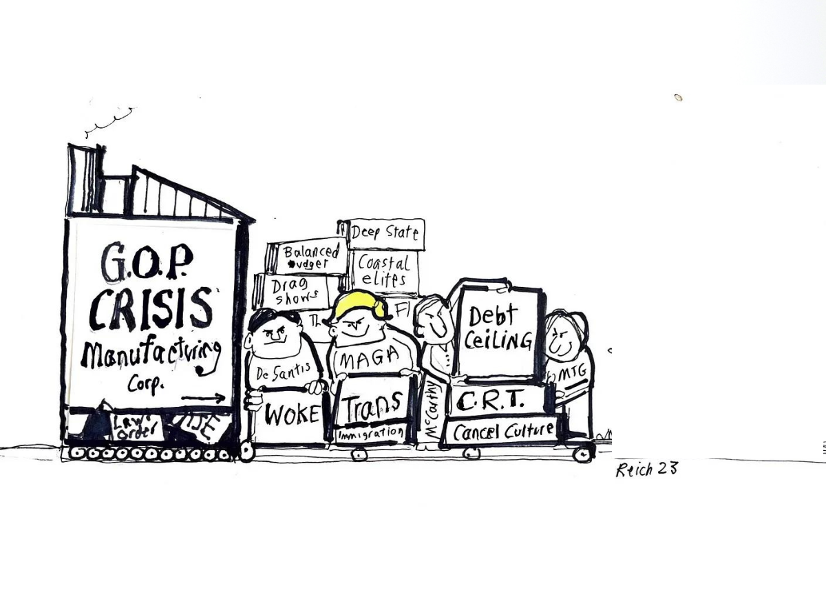 But Trump Republicans are busy denying or worsening all of these. With just five months to go before the 2024 election, they’re diverting the public’s attention to manufactured crises. They’re intent on whipping Americans into a fury about giant nothingburgers, such as: