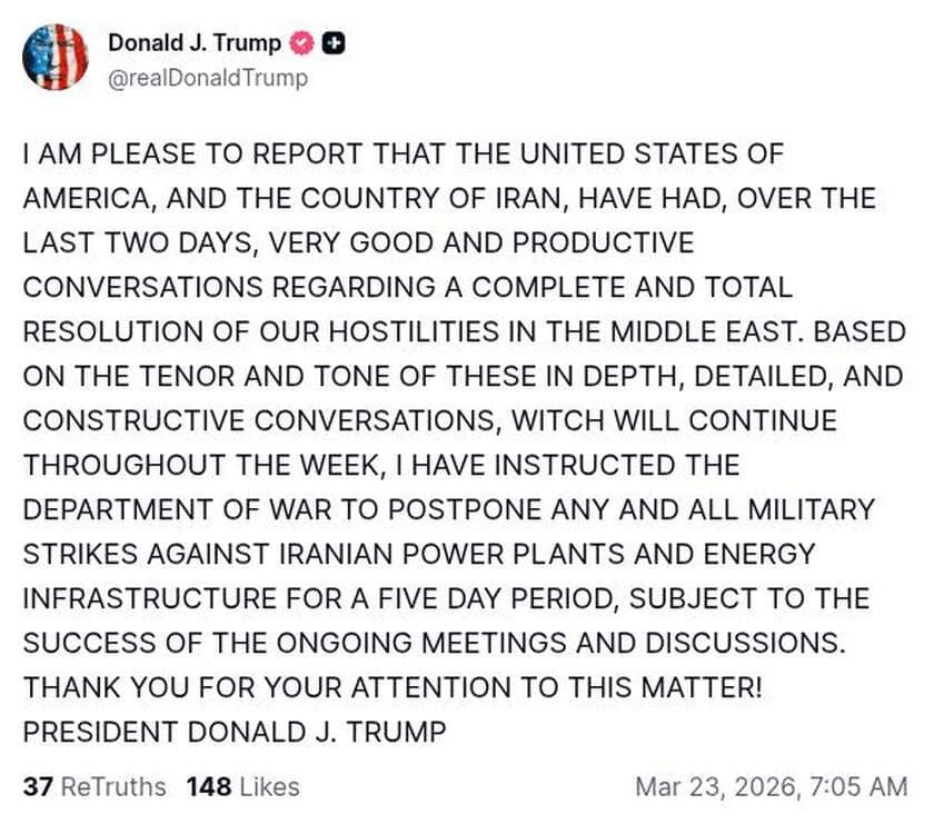 Because on Monday, March 23, at 7:05 a.m. ET, Trump posted on his Truth Social platform that Washington had held “VERY GOOD AND PRODUCTIVE CONVERSATIONS” with Tehran over a “COMPLETE AND TOTAL RESOLUTION” to hostilities.